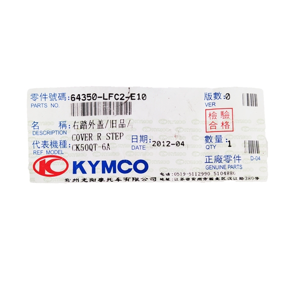 PILLION FOOTREST BAR KYMCO AGILITY CITY BACK RIGHT GENUINE PART
